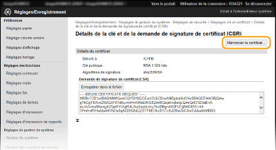 Vous ne pouvez pas utiliser la paire de clés générées par la demande de signature de certificat (CSR) tant que le certificat n'est pas enregistré. Une fois que l'autorité de certification a émis le certificat numérique, enregistrez-le à l'aide de la procédure ci-dessous.