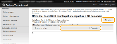 Cliquez sur [Parcourir], spécifiez le fichier associé à la demande de signature de certificat, puis cliquez sur [Mémoriser].