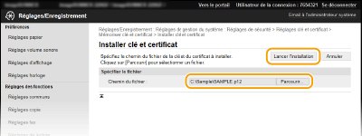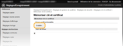 Cliquez sur [Réglages clé et certificat] pour installer une paire de clés ou sur [Réglages certificat CA] pour installer un certificat CA.