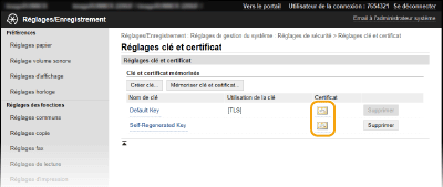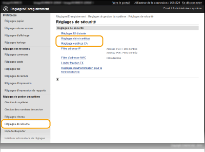 [Réglages clé et certificat] ou [Réglages certificat CA].