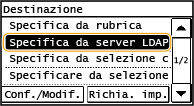 Se nell'ufficio è installato un server LDAP, è possibile specificare una destinazione utilizzando le informazioni utente nel server. Accedere al server LDAP tramite la macchina e cercare le informazioni utente appropriate e specificarle come destinazione.
