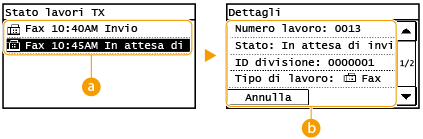 ![]() <Stato lavori TX>/<Stato lavori RX>Visualizza un elenco di documenti in corso di invio e ricezione o in attesa di elaborazione.