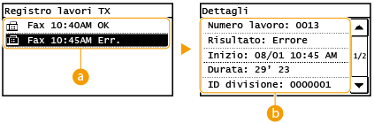 ![]() <Registro lavori TX>/<Registro lavori RX>Visualizza un elenco dei documenti inviati e ricevuti. <OK> viene visualizzato in caso di corretto invio o ricezione di un documento, mentre <Err.> viene visualizzato quando non è stato possibile inviare o ricevere un documento a seguito di annullamento o a causa di un errore.