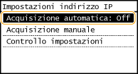 ![]() Se viene visualizzato <On>, toccare <Acquisizione automatica> e impostare sia <Selezione protocollo> e sia <IP automatico> su <Off>.