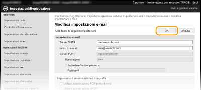 Utilizzare l'IU remota per configurare le impostazioni dettagliate di invio, quali quelle per l'autenticazione POP e la crittografia della comunicazione prima di inviare e-mail. Rivolgersi al provider o all'amministratore di rete per conoscere le impostazioni richieste.