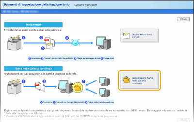 Configurazione SMB). Per configurare la macchina per salvare i documenti acquisiti in una cartella condivisa in rete tramite SMB, specificare prima la posizione della cartella condivisa da un computer. Questa sezione descrive come specificare la posizione di salvataggio tramite Strumenti di impostazione della funzione Invio.