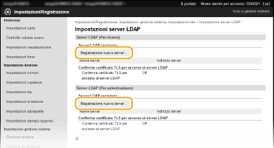 Fare clic su [Registrazione nuovo server] per [Server LDAP (Per ricerca)] o [Server LDAP (Per autenticazione)].