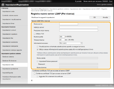 La registrazione del server LDAP prevede la separazione per ricerca o autenticazione. Per utilizzare un server LDAP per la ricerca di destinazioni fax ed e-mail, registrarlo per la ricerca, mentre per utilizzarlo per l'autenticazione nell'invio di fax o scansioni, registrarlo per l'autenticazione.