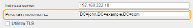 Quando si specifica il nodo, immettere "DC=" seguito da un nome host (una stringa di caratteri delimitata da punti nel nome di dominio Active Directory) e separare ogni voce con una virgola. Se il nome di dominio è, ad esempio, "john.example.com", immettere "DC=john,DC=example,DC=com".
