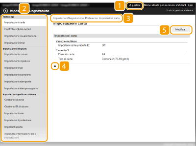 Visualizza la pagina [Impostazioni/Registrazione]. Dopo aver eseguito l'accesso nel Modo gestore sistema, è possibile modificare le voci di impostazione e salvare/caricare i dati registrati.