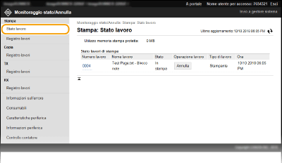 Fare clic su [Numero lavoro] sui documenti in pausa per visualizzare informazioni dettagliate. È possibile controllare nome utente e numero di pagina del documento stampato.