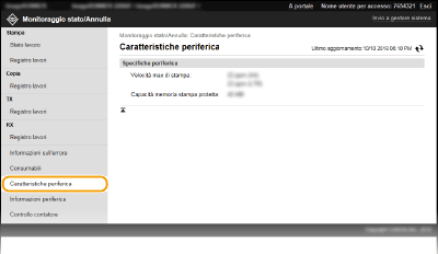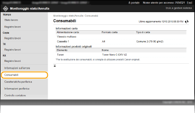Vengono visualizzati il formato e il tipo di carta nell'alimentazione, il numero di serie della cartuccia del toner e altre informazioni. È anche possibile fare clic su [Verifica dettagli consumabili] nella pagina Portale (pagina principale) per visualizzare la schermata di verifica dei materiali di consumo.