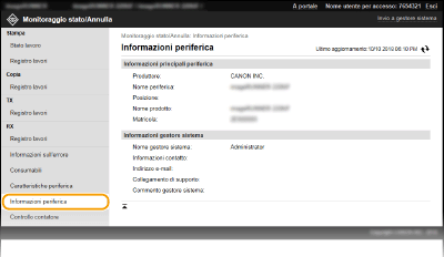 Vengono visualizzate le informazioni sulla macchina e su gestore sistema. Tali informazioni sono impostate in [Gestione sistema] nella pagina [Impostazioni/Registrazione].