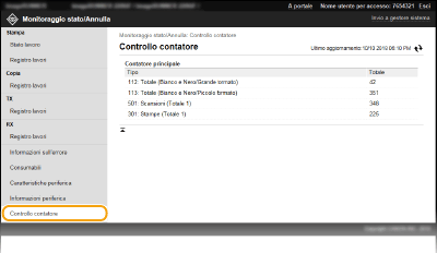 Viene visualizzato il numero totale di pagine stampate dalle funzioni di stampa, copia e fax.