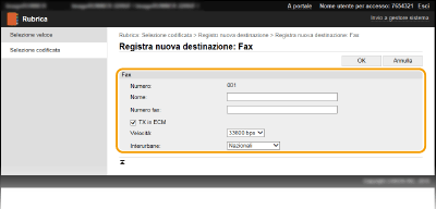 È possibile specificare anche [TX in ECM] e [Velocità] da <Impostazioni fax> (