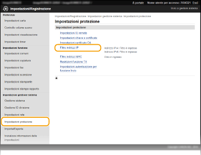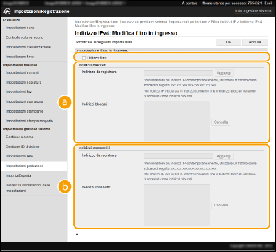 Se gli indirizzi IP sono immessi in modo non corretto, potrebbe non essere possibile accedere alla macchina dalla IU remota, in questo caso è necessario impostare <Filtro indirizzi IPv4> o <Filtro indirizzi IPv6> su <Off>. Filtro indirizzi IPv4 Filtro indirizzi IPv6