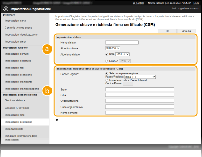 Quando è richiesta per la comunicazione tramite Transport Layer Security (TLS), è possibile generare una coppia di chiavi con la macchina. È possibile utilizzare TLS quando si accede alla macchina tramite la IU remota. Possono essere generare fino a cinque coppie di chiavi nella macchina (comprese le coppie preinstallate). I certificati autofirmati sono utilizzati con le coppie di chiavi generate in "Comunicazione di rete". Tramite una "Chiave e richiesta firma certificato (CSR)", è possibile richiedere un certificato digitale emesso da CA per la coppia di chiave generate dalla macchina.
