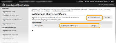 Fare clic su [Impostazioni chiave e certificato] per installare una coppia di chiavi o su [Impostazioni certificato CA] per installare un certificato emesso da CA.