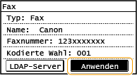 ![]() Wenn der Authentisierungsbildschirm eingeblendet wird, sobald Sie auf <Suche start.> tippen, geben Sie den Anwendernamen des Geräts und das auf dem LDAP-Server gespeicherte Passwort ein, und tippen Sie auf <Anwenden>. Speichern von LDAP-Servern