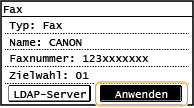 Der Anwendername sowie die auf dem LDAP-Server registrierte Faxnummer oder E-Mail-Adresse des ausgewählten Anwenders werden im Adressbuch registriert.