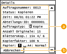 Die Anzahl an Kopien, die Einstellungen und weitere Details werden angezeigt. Wenn Sie nur die Details prüfen möchten, ohne das Kopieren abzubrechen, drücken Sie