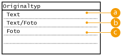 Auch wenn <Dichte> auf <Auto Dichte> oder <Originaltyp> auf <Text/Foto> oder <Foto> eingestellt ist, wird <Auto Dichte> abgebrochen.