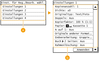 Sie können bis zu vier häufig verwendete Kombinationen der Kopiereinstellungen registrieren. Indem Sie eine registrierte Einstellungskombination bei Bedarf ganz einfach auswählen, müssen Sie nicht jedes Mal beim Erstellen von Kopien die gleichen Einstellungen konfigurieren, zum Beispiel wenn Sie häufig die Anzahl der Kopien auf 5 setzen, <Rahmenlöschung> auf <Ein> einstellen und die Schärfe beim Kopieren erhöhen. Sie können die Einstellungskombinationen unter <Einstellungen 1> bis <Einstellungen 4> registrieren.