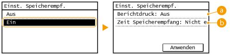 Wenn Sie empfangene Dokumente im Speicher ablegen möchten, setzen Sie <Einstellungen Speicherempfang> auf <Ein>. Sie können auch optionale Einstellungen angeben, wie eine Zeiteinstellung, die einen Zeitraum während des Tages festlegt, während dem empfangene Dokumente im Speicher abgelegt werden.