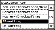 ![]() <Status SE-Auftrag>/<Status EM-Auftrag>Zeigt eine Liste der Dokumente an, die gerade gesendet oder empfangen werden oder sich in der Warteschlange befinden.