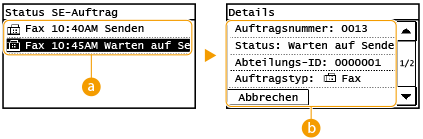 <Details>Zeigt detaillierte Informationen zum in der Liste ausgewählten Dokument an. Wenn Sie mehrere Empfänger angegeben haben, wird die Anzahl der angegebenen Empfänger angezeigt. Wenn Sie Details der angegebenen Empfänger überprüfen möchten, tippen Sie auf <Anzahl Empfänger>. Wenn Sie ein nicht benötigtes Dokument finden, drücken Sie <Abbrechen> oder <Löschen>, und tippen Sie auf <Ja>.