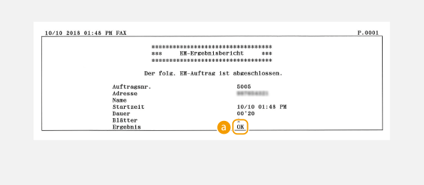 Sie können die Logs für empfangene Faxdokumente in einem EM-Ergebnisbericht drucken. Sie können den Bericht nach jeder Übertragung oder nur bei Empfangsfehlern drucken.