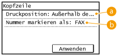 Legt die Position fest, an der die Kopfzeile im gesendeten Fax gedruckt wird. Wählen Sie <Innerhalb des Bildbereiches>, wenn die Informationen im Bildbereich gedruckt werden sollen, oder <Außerhalb des Bildbereiches>, um die Informationen außerhalb des Bildbereichs zu drucken.