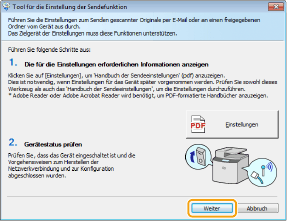 Das Tool für die Einstellung der Sendefunktion unterstützt Sie bei der Konfiguration von grundlegenden Einstellungen für das Senden von E-Mails. Sie können Remote UI anstelle des Tool für die Einstellung der Sendefunktion verwenden, um detailliertere Einstellungen wie beispielsweise Einstellungen für die POP-Authentisierung vor dem Senden oder für die verschlüsselte Kommunikation zu konfigurieren. Konfigurieren von Einstellungen für die E-Mail-Kommunikation