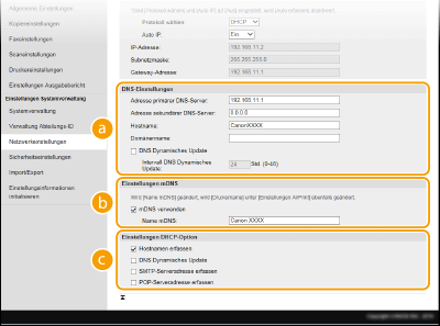 Das von Bonjour implementierte mDNS (Multicast-DNS) ist ein Protokoll zur Zuordnung von Hostnamen zu IP-Adressen ohne DNS. Aktivieren Sie das Kontrollkästchen, um mDNS zu aktivieren, und geben Sie den mDNS-Namen in das Textfeld [Name mDNS] ein. [Einstellungen DHCP-Option][Hostnamen erfassen]