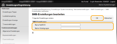 SMB (Server Message Block) ist ein Protokoll für die Freigabe von Ressourcen wie Dateien und Druckern für mehr als ein Gerät in einem Netzwerk. Das Gerät verwendet SMB zum Speichern gescannter Dokumente in einem gemeinsamen Ordner. Je nach Netzwerk müssen Sie eventuell den NetBIOS- und den Workgroup-Namen einstellen.