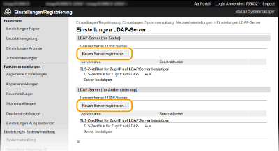 Klicken Sie [Neuen Server registrieren] für [LDAP-Server (für Suche)] oder [LDAP-Server (für Authentisierung)].