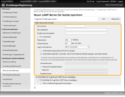 Das Speichern eines LDAP-Servers erfolgt nach Speichern für die Suche und nach Speichern für die Authentisierung getrennt. Wenn Sie einen LDAP-Server für die Suche von Fax- und E-Mail-Empfängern verwenden möchten, speichern Sie ihn für die Suche, und wenn Sie ihn für die Authentisierung des Sendens von Faxen oder Scans verwenden möchten, speichern Sie ihn für die Authentisierung.