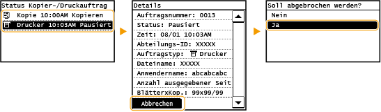 Wählen Sie das Dokument auf dem Bildschirm <Status Kopier-/Druckauftrag>