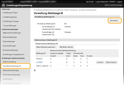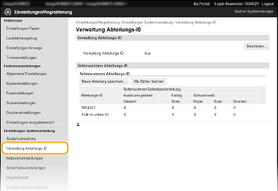 Klicken Sie auf [Verwaltung Abteilungs-ID], und speichern (bzw. bearbeiten) Sie Abteilungs-IDs.