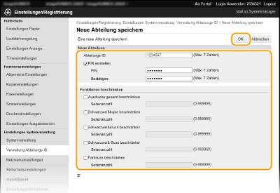 Speichern/Bearbeiten von Abteilungs-IDs und PINs