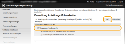 Aktivieren Sie das Kontrollkästchen [Verwaltung Abteilungs-ID], und klicken Sie auf [OK].