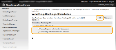 Weitere Informationen zu den Kontrollkästchen [Druckaufträge mit unbekannten IDs zulassen]/[Scanaufträge mit unbekannten IDs zulassen] finden Sie unter