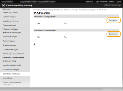 Wenn Sie falsche IP-Adressen eingeben, können Sie eventuell nicht mehr mit Remote UI auf das Gerät zugreifen. In diesem Fall müssen Sie <IPv4-Adressfilter> oder <IPv6-Adressfilter> auf <Aus> setzen. IPv4-Adressfilter IPv6-Adressfilter