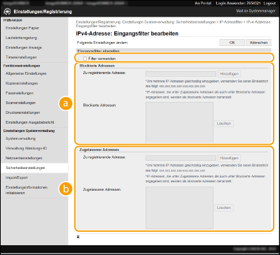 Lässt die Kommunikation (Empfang) nur mit Geräten zu, deren IP-Adressen unter [Zugelassene Adressen] gespeichert wurden, und schränkt die Kommunikation mit Geräten mit jeder anderen IP-Adresse ein. Die Kommunikation ist jedoch für IP-Adressen eingeschränkt, die auch unter [Blockierte Adressen] gespeichert wurden.
