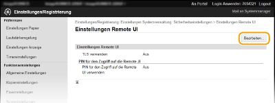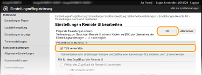 Verwenden der SystemsteuerungSie können die Kommunikation mit TLS-Verschlüsselung auch über <Menü> auf dem Bildschirm <Startseite> aktivieren oder deaktivieren. TLS verwenden