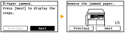 In some cases when an error occurs, instructions on how to respond to the error are displayed. Follow the on-screen instructions to solve the problem. The screen displayed when a paper jam occurs is shown below as an example (