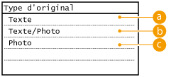 Même si <Densité> est défini sur <Densité auto>, lorsque <Type d'original> est défini sur <Texte/Photo> ou <Photo>, <Densité auto> est annulé.