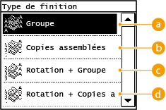 Lorsque vous envisagez de réaliser plusieurs copies d'un document de plusieurs pages, vous pouvez sélectionner <Groupe>, <Copies assemblées>, <Rotation + Groupe> ou <Rotation + Copies assemblées> pour définir l'ordre des copies. Cette fonction est très utile pour préparer des documents à distribuer lors de réunions ou de présentations.