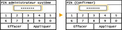 Définissez un PIN administrateur système réservé exclusivement aux administrateurs. Vous ne pourrez accéder aux <Réglages de gestion du système> qu'à condition de saisir le PIN qui convient. Seuls les administrateurs doivent connaître ce PIN.