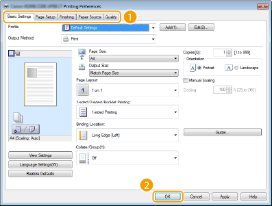 Make print settings as required on the [Basic Settings], [Page Setup], [Finishing], and [Quality] tabs.